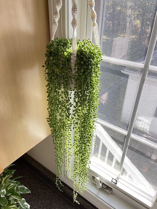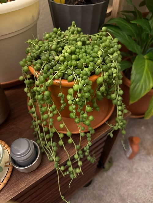 If indoors, use a grow light in winter. Keep the light 8–10 inches above the plant for 10–12 hours daily. If the pearls start to look spaced out or pale, that’s a sign they need stronger light.