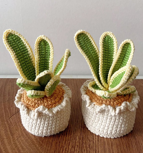 So, be it the flowers, leaves, or the pot, we’ll do it all. Let’s crochet this snake plant from the start to the end. Choose bright yarns, think about variegated leaves, and crochet dainty flowers to bring the final look.
