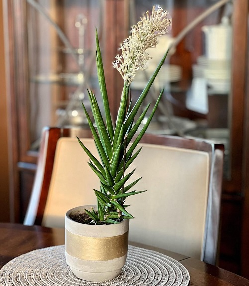 It stands out with its mottled green leaves that stretch 2 to 2.5 feet tall, making it a graceful plant. It looks more stunning when paired with other Sansevieria trifasciata, giving your home that lush, jungle-like vibe. Expect delicate yellow-and-white buds that bring a soft touch of elegance to your space when they bloom.