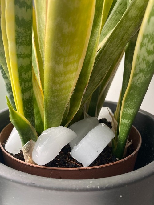 One of the worst things you can do to your snake plant and stunt its growth is to overwater it. For a drought-tolerant plant like the snake plant, which can tolerate days of neglect, you must only water when the soil is completely dry. But if you tend to give your plants extra love always, this idea can be a lifesaver—using ice cubes!