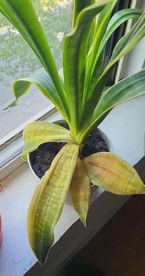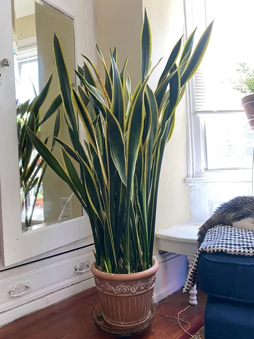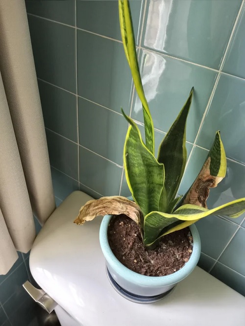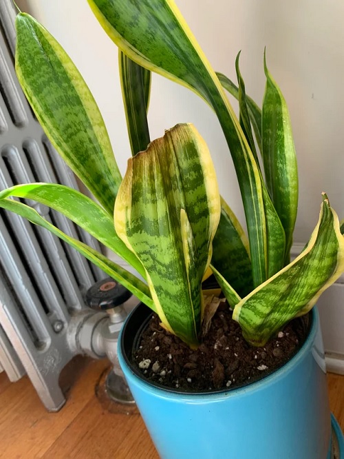 The snake plant is a tropical plant and prefers temperatures between 60–90°F. When kept near drafty windows, its leaves turn yellow or show a yellow streak in protest.