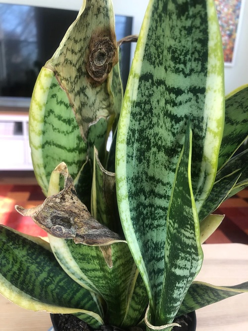 Too much sunlight will make us tan, and the snake plant gets its leaves burned. Excessive light from glass windows intensifies the rays and yellowing of leaves or even scorching can be seen.