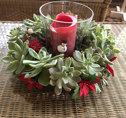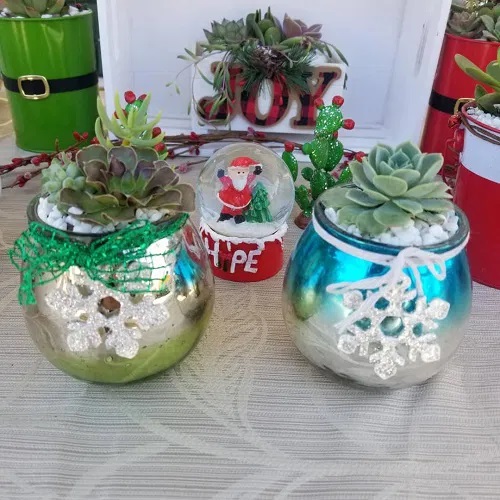Are you tired of making your glass bowl look just like a bowl every holiday? Well, it is time to add some succulents on white pebbles, with some decorative artificial plants, and don’t forget to add a little snowman for the final touch.
