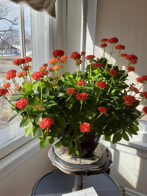 The flowers of the Kalanchoe are showy and come in scarlet, pink, salmon, or yellow colors. It has scallop-edged leaves and large umbels of flower clusters held above the foliage for weeks. Their blooming time is from late winter to early spring. You can trigger them to bloom at any time by giving them 14 hours of total darkness daily for 6-8 weeks to simulate winter conditions.