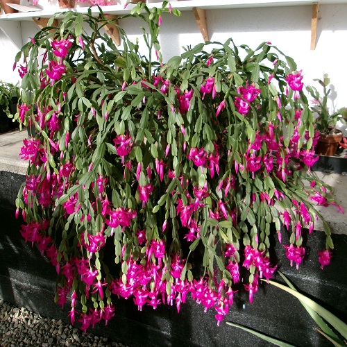 They are also known as Crab cactus, False Christmas cactus. They have pointed, sharp teeth or lobes (crab-like), which are T-shaped segments. The flowers are in brighter colors, like red, face outward/up, and bloom in November or December. An east-facing window is an ideal place to keep them, but a shaded southern or western window works as well.