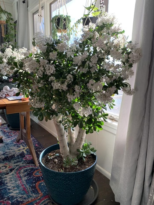 It is hard to see them bloom, but if your home is dry, there’s a chance of seeing white or pink flowers on the jade. They have smooth, rounded, glossy, egg-shaped leaves that are borne in opposite pairs. The clusters of small, star-shaped flowers are produced in response to long nights. They typically bloom from December to March.