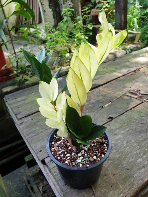 Freckles on the plant, which could be attributed to the Variegated ZZ plant! The research indicates it can be propagated through leaf cuttings in well-drained media, and new, stable variegated forms can be induced using colchicine treatment. The green, white, and yellow color combination on the plant makes it more captivating.