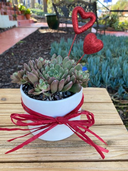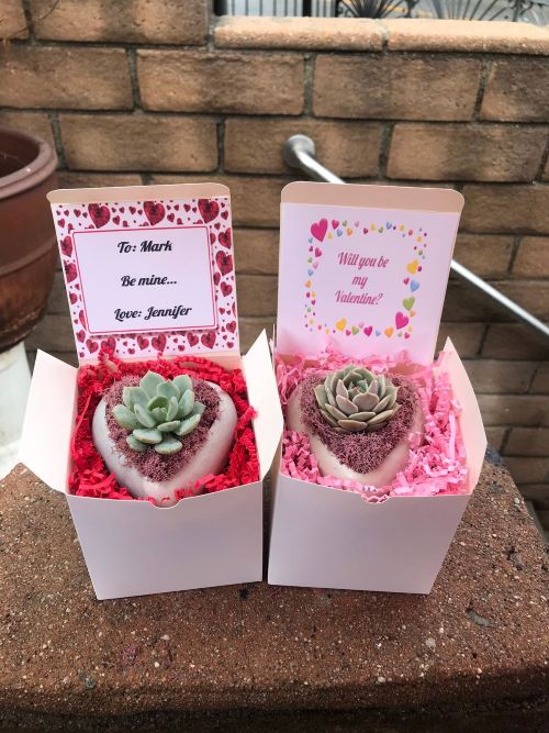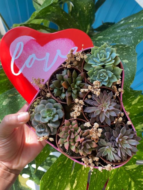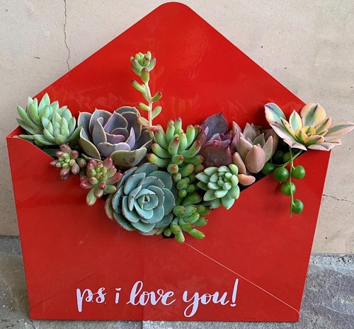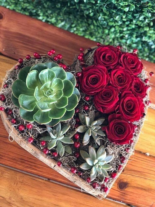 Confused if you should gift your heart rose or rosette succulents? Why not both? Take a heart-shaped box, fill in some red beads and shredded paper, and you are almost done. Place some roses on one side and succulents on the other because Valentine’s Day calls for everything you can give in the name of love.