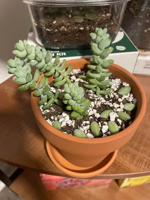 In a few weeks, tiny roots and baby leaves will appear. Once the roots grow longer, cover them with a little soil to anchor them. When the plantlets are strong enough, move them to small pots. Handle gently—Burro’s Tail leaves fall off at the slightest touch.