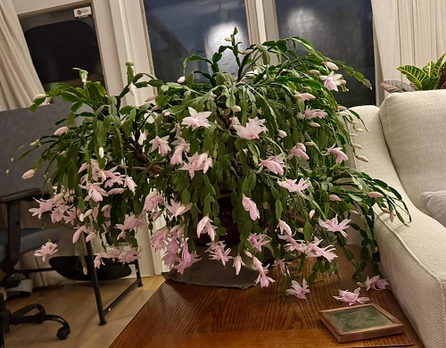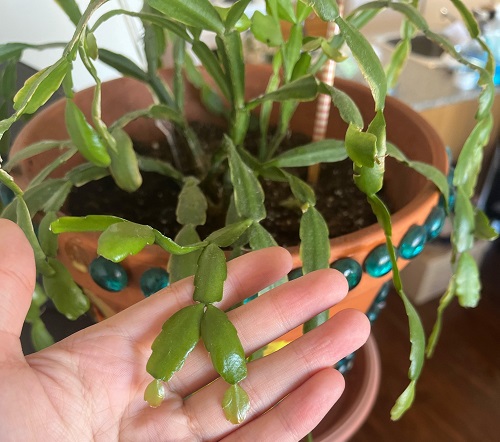 Please don’t pour used tea leaves with sugar and milk into the Christmas Cactus. Use cool, plain tea water at least once every 45 days. It will boost the leaf color, improve the nutrient absorption, and slightly acidify the soil. Coffee water (very diluted) also works, but use it sparingly to avoid over-acidifying.